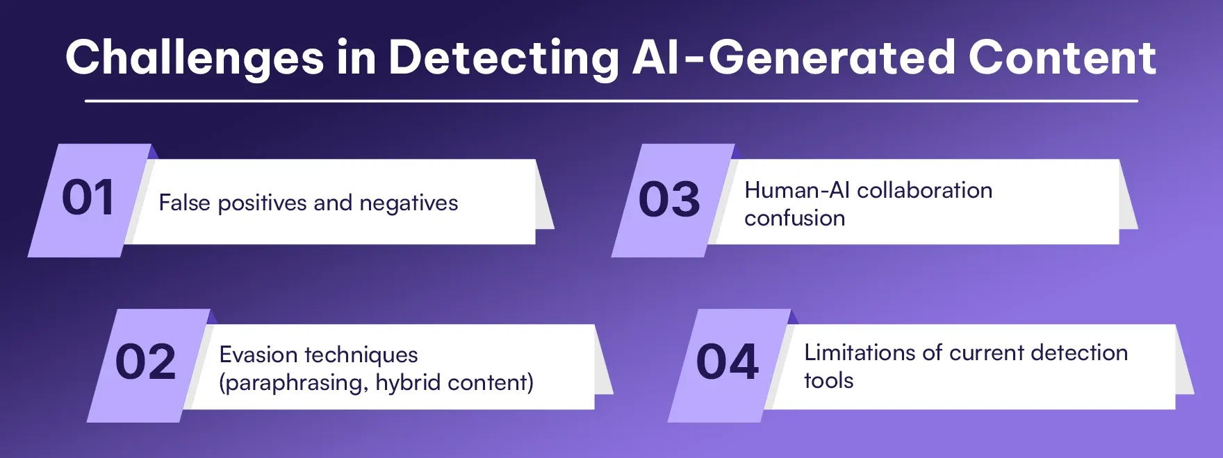 4. Limitations of Current Detection Tools: It is difficult to detect content that is short or multi-lingual, and adversarial models.