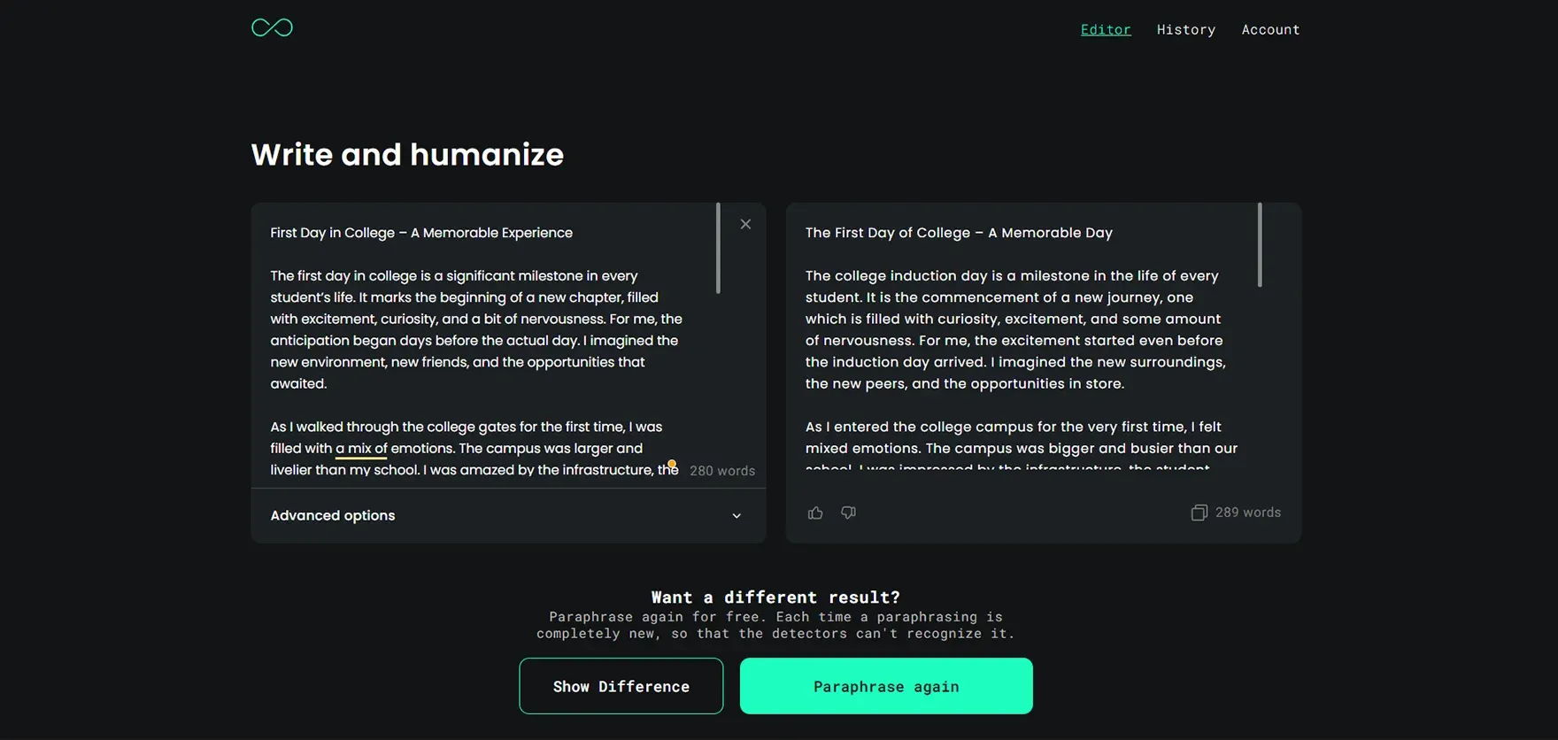 Result : 100% humanized content, but content quality is very low, because it makes a lot of grammatical mistakes intentionally.